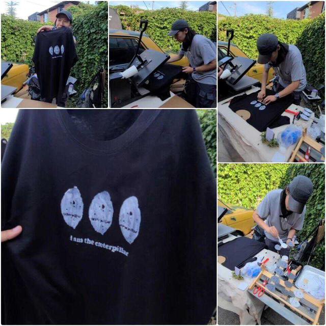 棚子旁邊還放了一台黃色的汽車以及一台機器,汽車應該是他們自己開過來的,機器則是印刷T恤用的,只要客人需要,他們就能幫對方在T恤上印上不同的圖案。