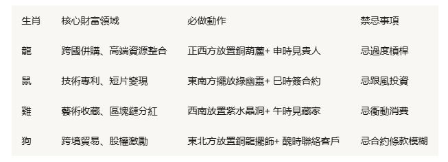 屬龍/ 狗:西北方放置「聚寶盆」(內裝五帝錢+ 黃水晶),增強事業財運。