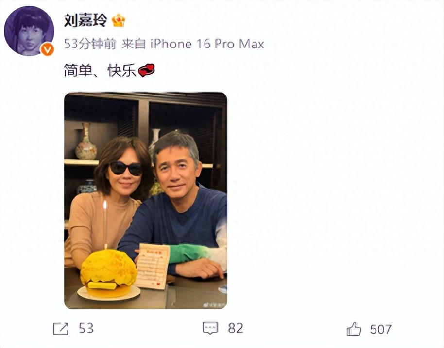 12月9日,劉嘉玲發文「簡單、快樂」慶祝59歲生日,曬出與梁朝偉的合照。