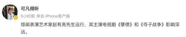 不過,在2014年結束電影《藍色骨頭》拍攝後,他就幾乎不出現在螢光幕前,直到近日才又有他的消息。大陸知名主持人曹可凡今(26)日在微博發文,透露趙有亮過世的消息,「驚聞表演藝術家趙有亮先生遠行,其主演電視劇《孽債》和《奪子戰爭》影響深遠」,讓許多網友相當驚訝。