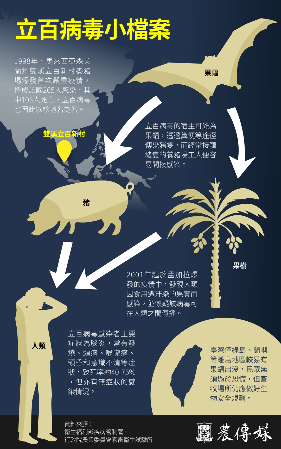 預防方面,民眾應避免接觸果蝠或疫區的豬隻,不要食用可能遭果蝠分泌物污染的水果、椰棗或樹汁。同時要養成勤洗手習慣,若需接觸動物時,應配戴適當防護裝備。照顧疑似病患時,也要特別注意避免接觸其血液、體液及排泄物。