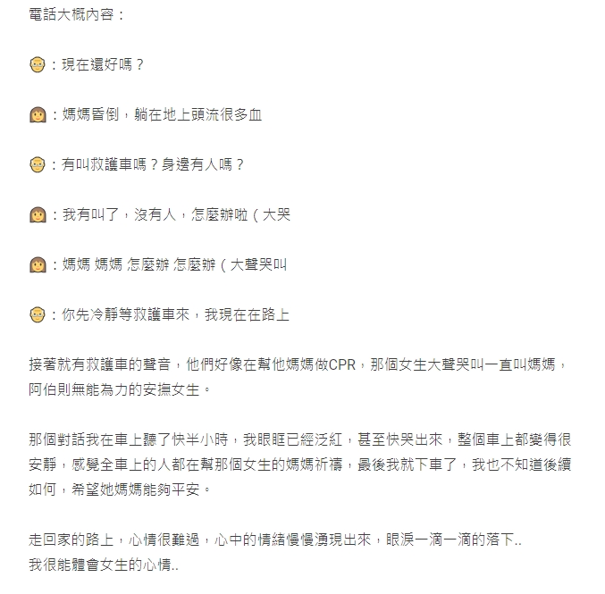其中電話那頭傳出醫護人員幫忙母親CPR的聲音,更讓大家聽到都快哭出來,男高中生難過地說,自己的爸爸以前在山上做水電,也是突然被砸到昏迷,只是山區收訊差,等到要送急救時,已經過了一個小時以上,最後仍然不治,讓他想到當時,就忍不住落淚;而PO文貼出後,也有不少人哽咽留言:「光看文字就想哭..」、「家人發現癌症到離世不到一年...真的是非常能夠感同身受」、「上次在急診聽到爸爸對女兒說『媽媽車禍,好像不行了,怎麼辦』也是一秒掉淚...」