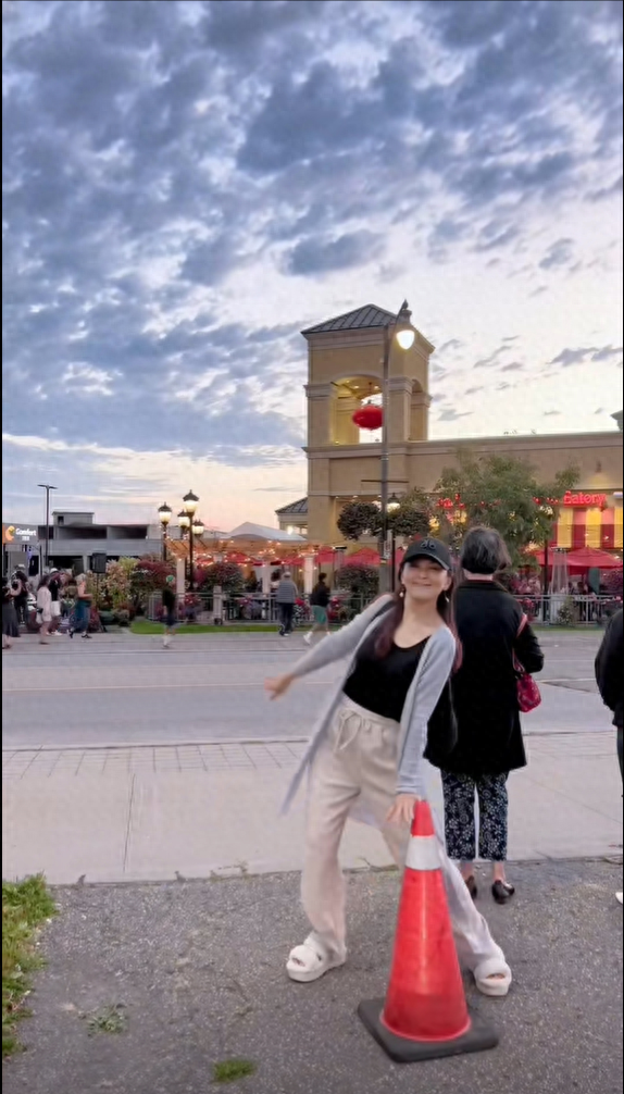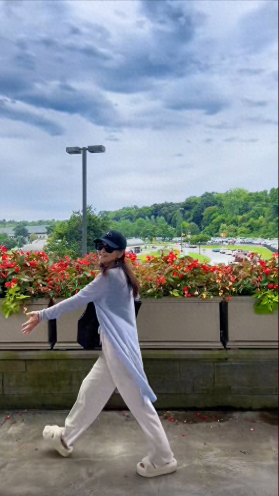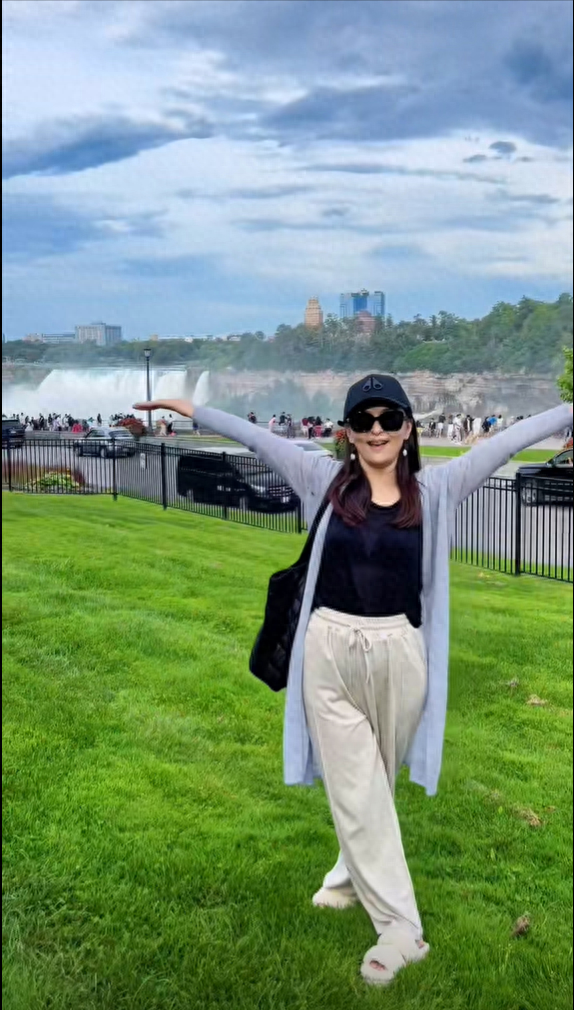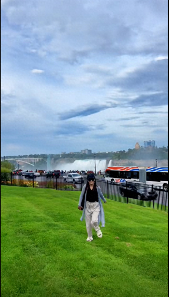 當天,何音穿著天藍色長袖針織衫,內搭黑色貼身背心,穿著拖鞋和長褲,帶著墨鏡和帽子,遊走在加拿大的大街小巷。她去了加拿大的知名景點尼加拉瀑布,在瀑布前的草坪上快樂地跳舞。