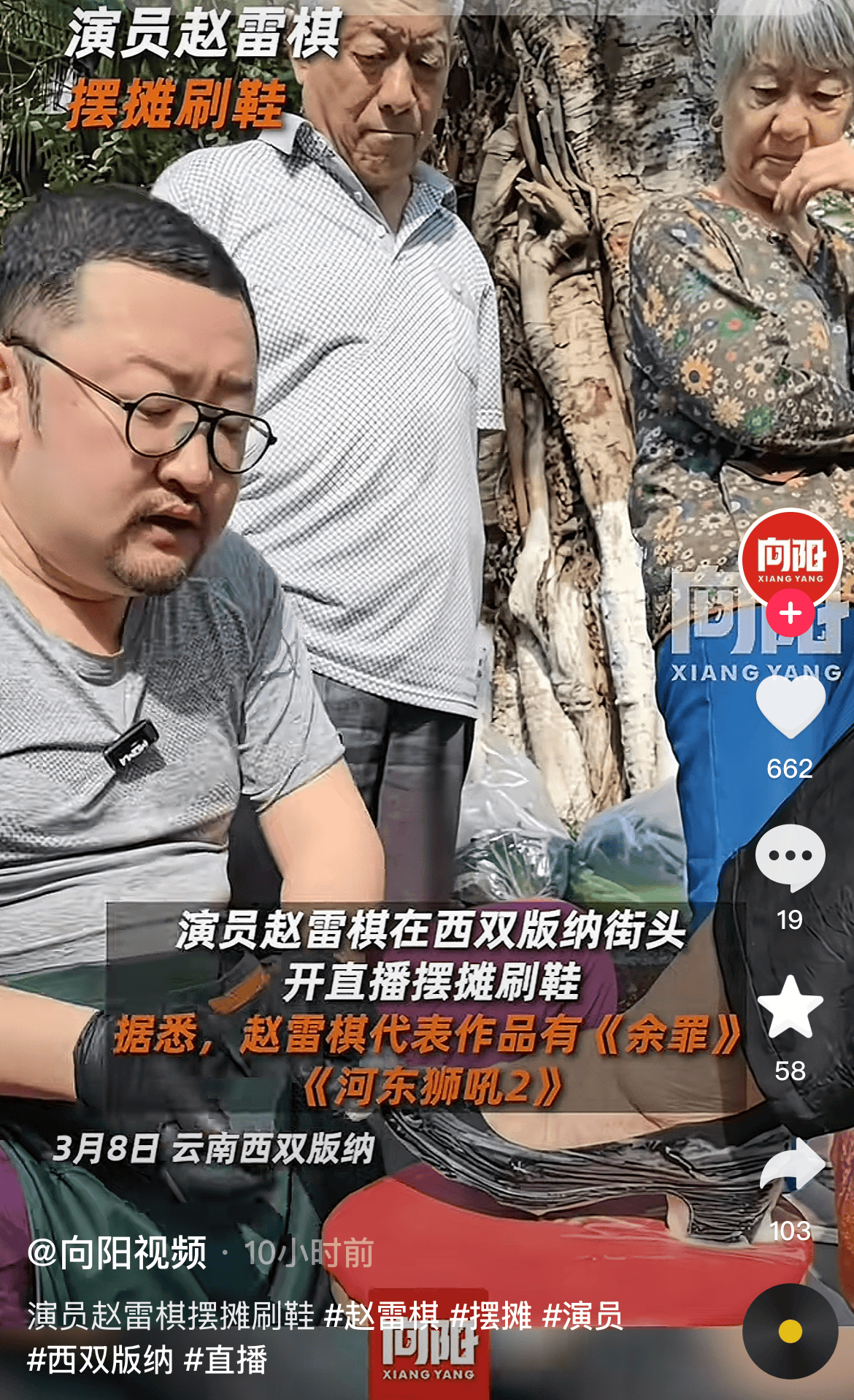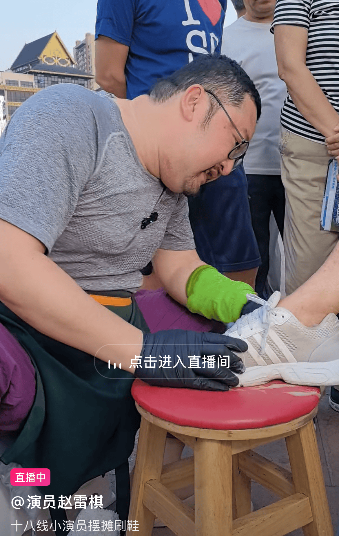 3月8號,就有網友發現,自詡「十八線演員」的41歲趙雷棋,穿著簡單灰色上衣、綁個圍裙,拿張小板凳,就開始給客人擦鞋子,並將這畫面現場直播,耐心回應網友一個個提問,樸實又接地氣的言論,贏得了很多粉絲的喜歡,同時也揭露了演藝圈小演員的境況。