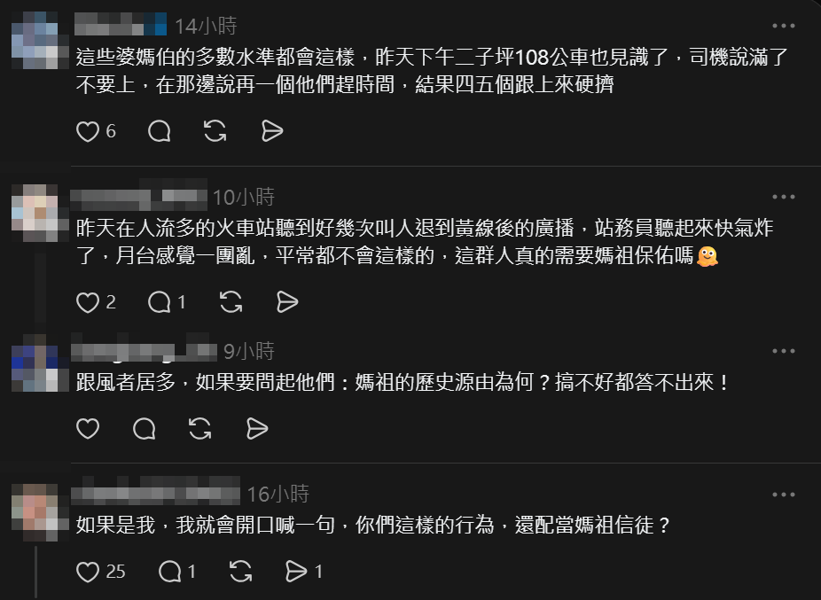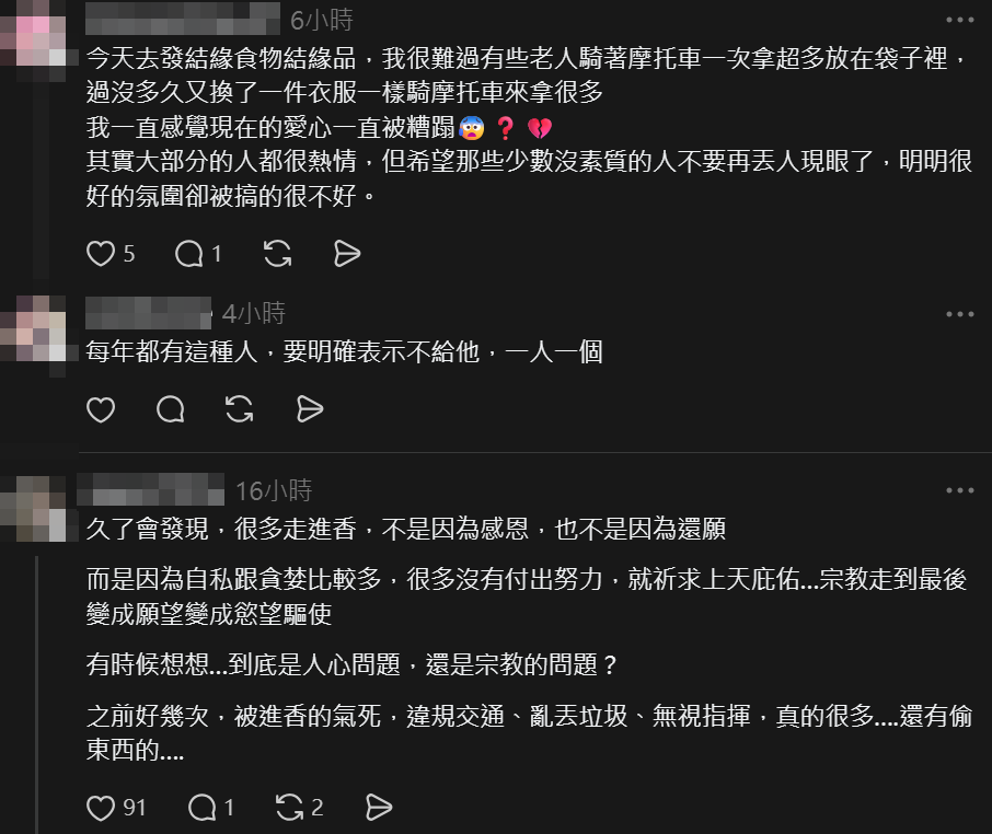就連參與進香的信徒也感到無奈,有香燈腳坦言「少數沒素質的人真的很丟臉」,還有人分享發放結緣品時,目睹有長者騎機車重複領取物資,甚至換件衣服再來拿一次,讓愛心被濫用。不少信徒呼籲「大部分人都很熱情,希望那些少數沒水準的人別再丟人現眼」,強調真正的修行應該從日常生活中的基本禮儀做起。