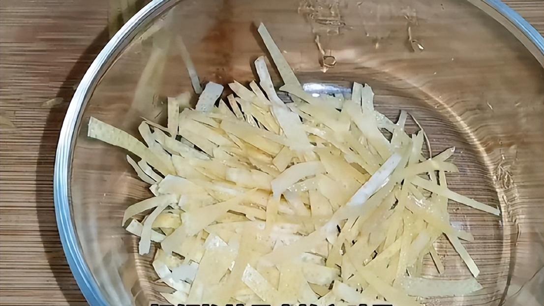 1.買回來的柚子用鹽搓洗外皮,洗乾淨之後把皮削下來,然後把白色的瓜膜刮掉。改刀切成細絲。放入碗里,加入鹽和清水浸泡半個鐘。