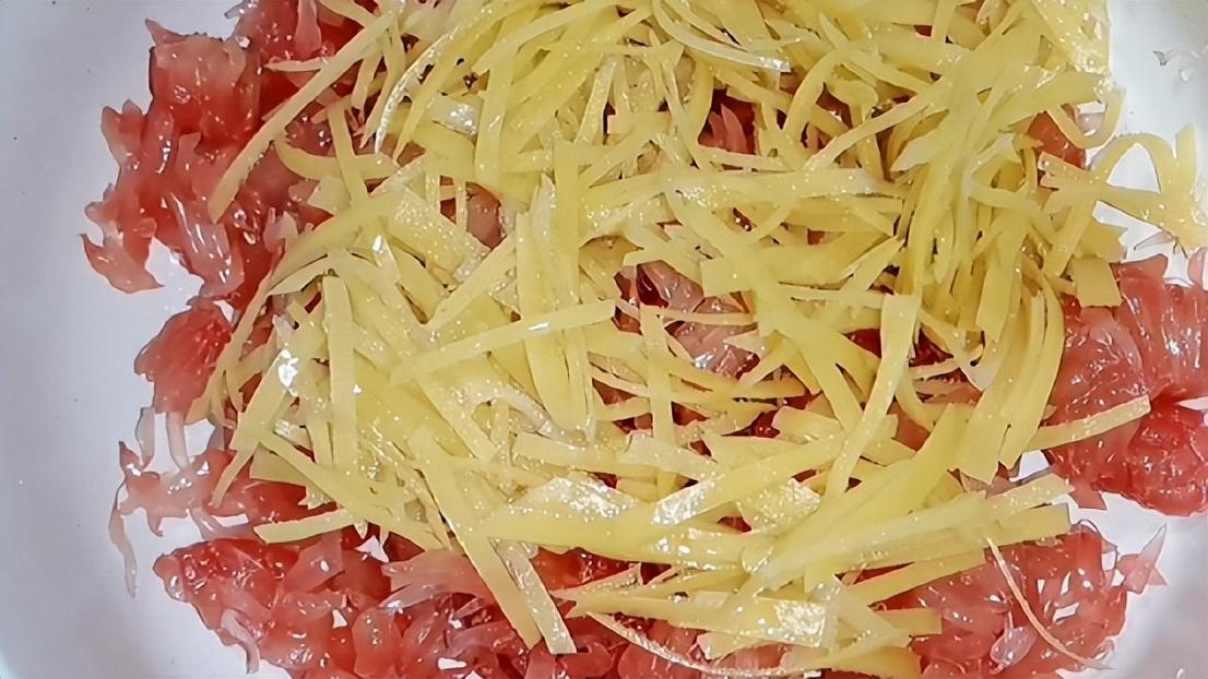 3.浸泡好的柚子瓤,用水沖洗乾淨,鍋里放入開水,柚子瓤放進去,焯水三分鐘。撈起來放入盆里再沖洗幾次,擠乾水分。