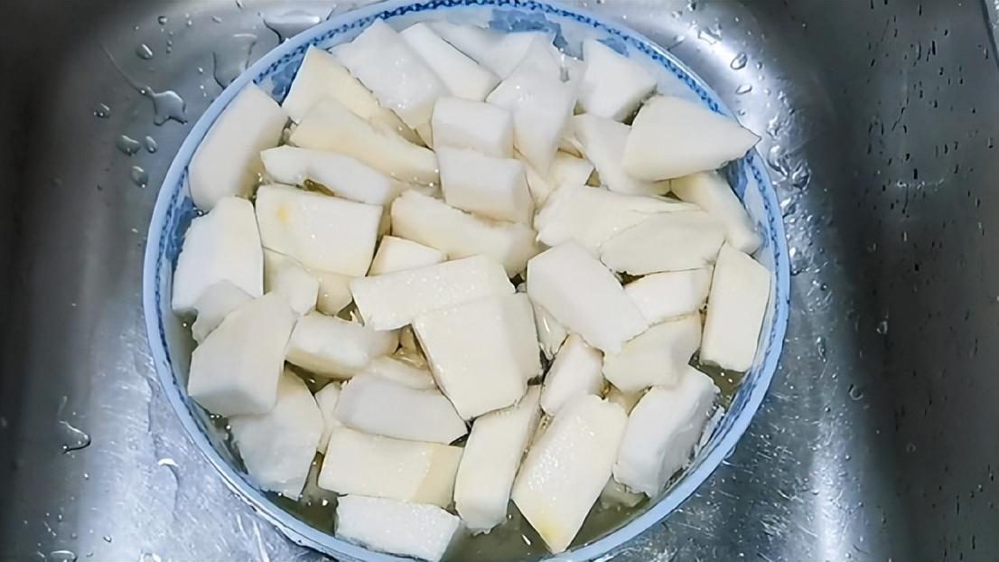 1.把柚子肉取出來。這些白色的饢不要扔掉,可以用來做柚子糖,把柚子肉取出來,這個白色的瓤改刀切成小塊,放入碗里,加入食用鹽,加入清水浸泡半分鐘,撈出來,用流動清水沖洗乾淨,放入鍋里焯水三分鐘。這個焯水的步驟主要是去除柚子皮的苦澀味。