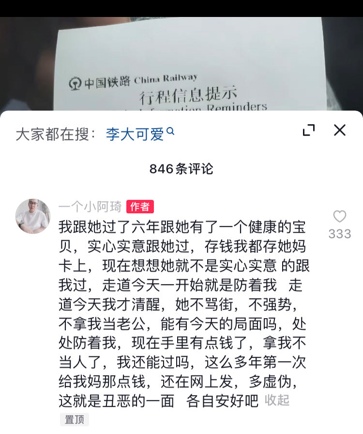 他說:妻子太強勢了,在出名後幾乎不把他當人,他覺得對方一直在防著自己,不是實心實意的想跟他過日子。