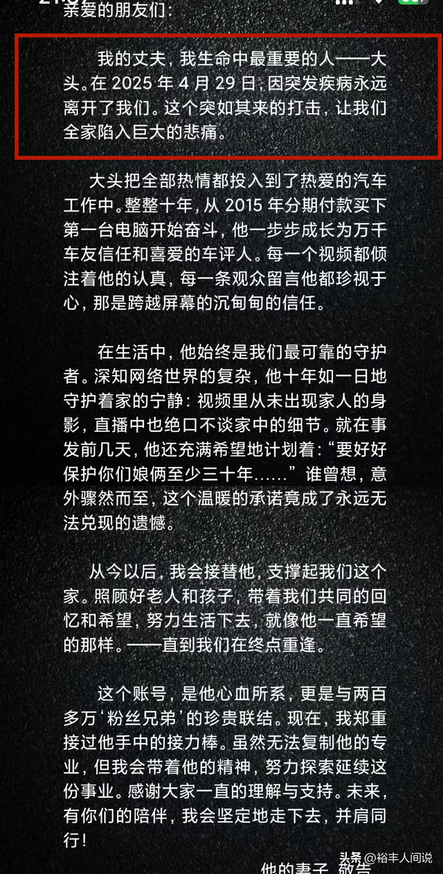 訃告中透露,大頭是在4月29號逝世,具體的死因則是突發疾病,但是何種疾病暫時沒有透露,不過根據說車人的職業特性來分析,應該是高強度的工作加上熬夜,由此導致三高問題,進而誘發突發性疾病。
