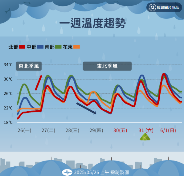 端午連假天氣部分,5月30日各地將逐漸轉好,但南台灣脫離雨勢時間最晚,南部地區、中部山區及花東有短暫陣雨,假期後兩天轉為晴時多雲,氣溫逐漸回升,僅山區午後有零星降雨機會。溫度方面,周四鋒面通過,東北季風增強再降溫,中部以北低溫20度,周六東北季風減弱回溫,西半部高溫回到30度,東半部26至28度。