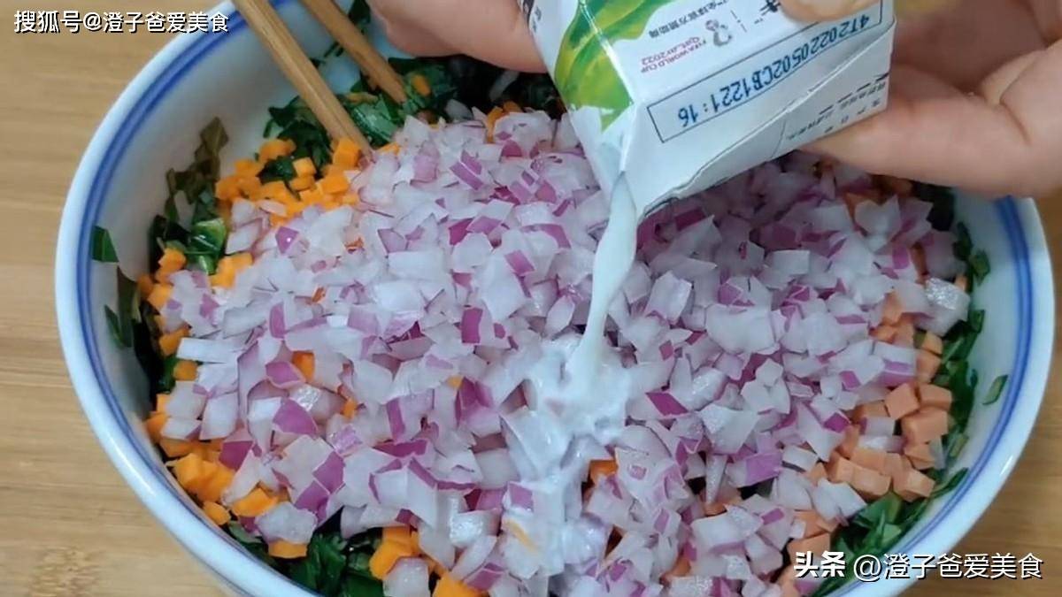 2.一根胡蘿蔔,先切成片,再切成細絲,切成胡蘿蔔丁,再把火腿切成小丁。半個洋蔥切碎的洋蔥丁,都放入碗中,倒入半瓶牛奶,
