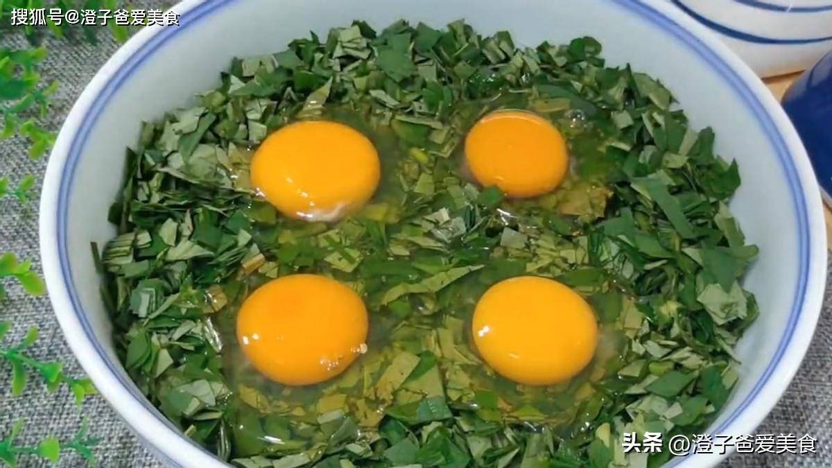 1.把地瓜葉清洗乾淨,用刀切碎,放入碗中。往裡面打入4個雞蛋,攪拌均勻,放一旁備用。