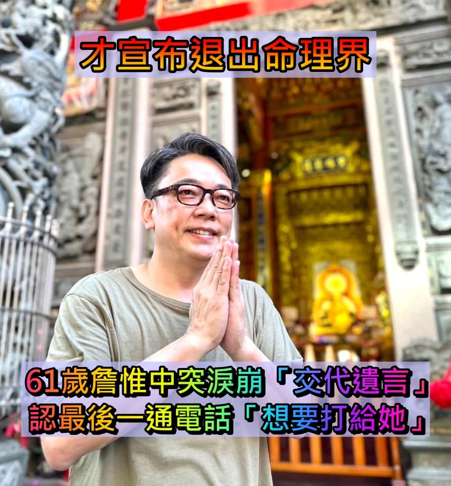 才宣布退命理界!詹惟中突淚崩「交代遺言」 最後一通電話「想要打給她」 檸檬塔好酸 2026-02-05 檢舉 圖片來源:詹惟中臉書這場突如其來的父女對話,不僅化解多年來隔閡,也讓在場所有人見證了一場動人的親情告白。最後,詹惟中也感慨交代後事、訴說遺言,並特別提出兩個請求,希望女兒能為他燒紙錢,就算她身為基督徒,也可請人代勞;另外,他期盼粉絲能為他助念,只求走後能前往好的世界。圖片來源:詹惟中臉書參考來源:中時電子報 Advertisements 回首頁 2/2 Advertisements 猜你會喜歡 多年風評破功!61歲詹惟中算命「收5800只聊13分鐘」 女顧客怒發文「控訴完全不準」:覺得被騙了... 差點認不出來!詹惟中「突消瘦9kg」認了惡疾纏身 遭醫生警告「嚴重恐截肢」:為了女兒努力活著 編輯精選推薦 More + 當年親吻1歲嬰!42年後「對方竟成巨星」同框劉德華 「超高顏值如兄弟」粉絲喊:真的差19歲? 24歲兒失明!于美人爆「他在飯店掃廁所」維生 不盼紅包只求「別再花我的錢」 弟成植物人、姊猝逝!玉女歌手「遭前夫設套」騙走娘家房產 「狠斬16年婚姻」近況曝 台語歌后慟別摯愛!告別式上認「早隱瞞病情」 道歉哭喊:原諒我簽放棄急救 離婚18年!前夫早知方文琳罹癌「願意付手術費」 「1理由遭拒」爆她術後狀況 台灣大咖病逝「享壽83歲」!周遊告別式痛哭「認婚內出軌」:兒子很恨我... 空窗多年!68歲陳美鳳突羞認「身邊有個他」 40年前就認識「遭男方母親拆散」 李英愛輸了!73歲富商尪「超凍齡像40壯年」站一起超登對 「不時甜蜜咬耳朵」網羨慕 慶祝17歲愛女畢業!53歲大咖「兒女皆讀名校」年花千萬 驕傲「她獲三大獎」:又美又自信 臨時找不到保母!女學生硬著頭皮「帶寶寶去大學上課」 教授霸氣伸手「寶寶我來抱吧」畫面超溫馨 趕在40歲前閃婚!八點檔女星「宣布嫁給他」 尪驚人身分曝「媒人是柯叔元」 旅美多年!資深女星「堅持落葉歸根」回國5天安詳離世 死前「砸600萬做1事」眾人淚目 婚變尪落跑!單親媽「獨扛千萬債養孩」到處躲黑道 「一開口驚艷眾人」熬成台灣歌后 晚年兒孫滿堂!73歲影壇大哥「拄拐杖現身」腳步蹣跚 兒子「全程攙扶不喊累」網羨:又帥又孝順 本土劇女星生了!7年前凍卵「終於來到我身邊」 歌手尪嗨喊:生個足球隊 最新/賈靜雯深夜慟曝「她已離世」 淚PO合照喊:真的好愛你... 再婚2年了!43歲李燕突喊「當媽媽實在太辛苦」 認「已經有愛的結晶」:最完美的幸福❤️ 22歲愛女病逝!資深男星「走不出喪女痛」留白長髮現身 掛骨灰項鍊「代女做1事」惹淚 15歲兒「睡夢中離世」!本土女星「送愛子火化」求做1事 「PO照圓滿了」:媽媽和你永不分開 大咖男星妹妹出嫁!全身金飾「曾獲近千萬豪宅」嫁妝豐厚 兄妹長超像「一看媽媽懂了」:基因強大 功德圓滿了!台語歌后「悲曝他離世」享壽95歲 淚喊:去當快樂的神仙吧... 曾比江蕙紅!台語歌后「爆未婚生子」遭指指點點 「2次手術害癱瘓」72歲近況曝 快養不起小孩!本土男星「開計程車、斜槓房仲」 突宣布「離開台灣」:演藝圈沒工作 以為只是小感冒!本土女星悲痛證實「他併發肺炎過世」 一度淚灑現場「後悔同意插管」 晚年隱居台東!68歲名主持失蹤「車內身亡」 伴侶悲曝「死前做1事」:還掛念著我