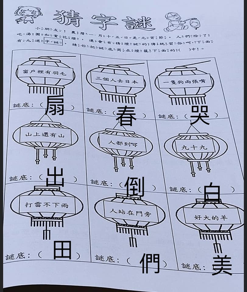 國小寒假作業「猜字謎」要解9字謎底!問「三個人去日本」大人想破頭:求高手~ Daphne 2024-01-21 檢舉 這些題目乍看讓人有些摸不著頭腦,但其實仔細一想還是可以想到答案的!網友們就紛紛幫忙解答出來,正確答案應分別為:扇、春、哭、出、島、白、田、們、美。也有不少人笑虧:「自己的功課自己寫!」、「人站門旁 們 動點腦 很好解」、「春節作業沒寫現在才來求救嗎」、「Google很好用哦」。(圖/爆廢公社)是說小時侯覺得猜燈謎還滿有趣的,怎麼長大後反而就被考倒了呢?XD來源:爆廢公社 Advertisements 回首頁 2/2 Advertisements 編輯精選推薦 More + 6歲童長膿癬永久禿頭!醫檢查驚「兇手竟是牠」小孩易感染 大咖男星妹妹出嫁!全身金飾「曾獲近千萬豪宅」嫁妝豐厚 兄妹長超像「一看媽媽懂了」:基因強大 曾比江蕙紅!台語歌后「爆未婚生子」遭指指點點 「2次手術害癱瘓」72歲近況曝 27歲男每天喝7、8瓶!走路掰咖去檢查「骨頭全壞死了」 22歲愛女病逝!資深男星「走不出喪女痛」留白長髮現身 掛骨灰項鍊「代女做1事」惹淚 準媽媽「讓2萬隻蜜蜂爬滿孕肚」拍獨特孕婦寫真!預產期前6天「寶寶卻不動了」:只被螫3次... 快訊/桃園驚傳「停課92班」1病毒爆發 疾管署曝:「已9例死亡」 王力宏驚喜宣布「再度當爸爸」當場激動落淚! 膽固醇飆260!醫生建議「每天吃1水果」半顆就夠 48歲男子照做「三個月後擺脫藥物」找回健康 相差18歲!58歲康康自爆「與老婆分房12年」驚呆眾人 提到沈玉琳「坦言罹同1病」:必須警惕... 親自抱下女兒遺體!郭主義喪女5年「鼓起勇氣做一事」 潰堤曝「心碎畫面」:永遠做妳驕傲的老爸 住兒子家養老!我9年來「從沒和兒媳吵過架」總結出6條經驗 第一條「客廳的沙發不要坐」上了一課 再婚2年了!43歲李燕突喊「當媽媽實在太辛苦」 認「已經有愛的結晶」:最完美的幸福❤️ 功德圓滿了!台語歌后「悲曝他離世」享壽95歲 淚喊:去當快樂的神仙吧... 很多人忽略了!保單「這1點沒注意」恐白繳30年保費 快訊/告別週末回暖!週一再變天「全台濕冷」 入冬最強冷空氣「這天下探10度」直逼冷氣團 男子突發腦出血走了!醫生怒斥:「吃降壓藥時候,沒有注意這3點!」 慶祝17歲愛女畢業!53歲大咖「兒女皆讀名校」年花千萬 驕傲「她獲三大獎」:又美又自信 天生命好!老了無病痛「能長壽」的4個生肖女 晚年不給子女添麻煩「一生福氣多多」 15歲兒「睡夢中離世」!本土女星「送愛子火化」求做1事 「PO照圓滿了」:媽媽和你永不分開 離婚11年!洪榮宏愛女結婚「終破冰前妻」 「2爸爸牽她進場」催淚畫面曝 本土劇女星生了!7年前凍卵「終於來到我身邊」 歌手尪嗨喊:生個足球隊 晚年兒孫滿堂!73歲影壇大哥「拄拐杖現身」腳步蹣跚 兒子「全程攙扶不喊累」網羨:又帥又孝順 24歲兒失明!于美人爆「他在飯店掃廁所」維生 不盼紅包只求「別再花我的錢」 台語歌后慟別摯愛!告別式上認「早隱瞞病情」 道歉哭喊:原諒我簽放棄急救