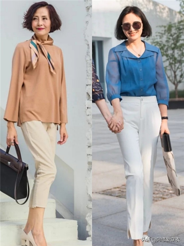 關於長度的選擇,其實中年女人穿褲子不能以為越長越好,像短褲的搭配不得體,過於長的褲子穿起來又覺得拖沓。最佳的長度便是九分長,這種九分長褲能夠剛好卡在腳踝處,修飾我們的腳踝,能夠起到顯瘦增高效果,而且這種露腳踝的方式也恰到好處,既保留了露膚度,還不會覺得太沉悶。