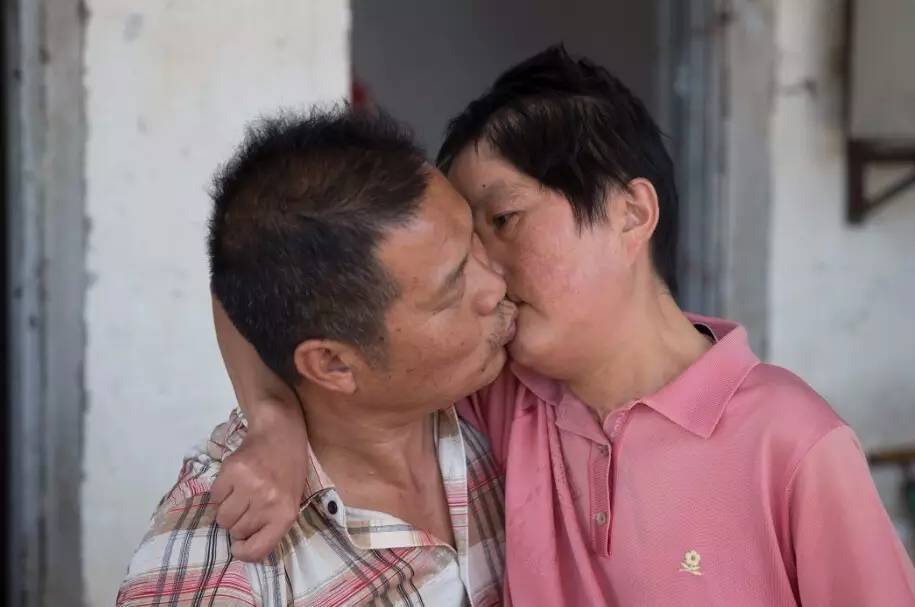 右手是妻子唯一能動的肢體,她的手從他的脖子繞過,抓著他肩膀的衣服不放,動作非常緩慢地向他貼過去,把嘴貼在他臉上,這個時候,他興奮得能笑很長很長時間