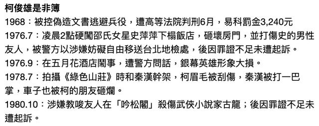 柯俊雄做的最大的惡應該是傷了古龍的手,就因為古龍不肯到他的房間給他敬酒。古龍大出血之後送到醫院急救,全身換血染上肝病。