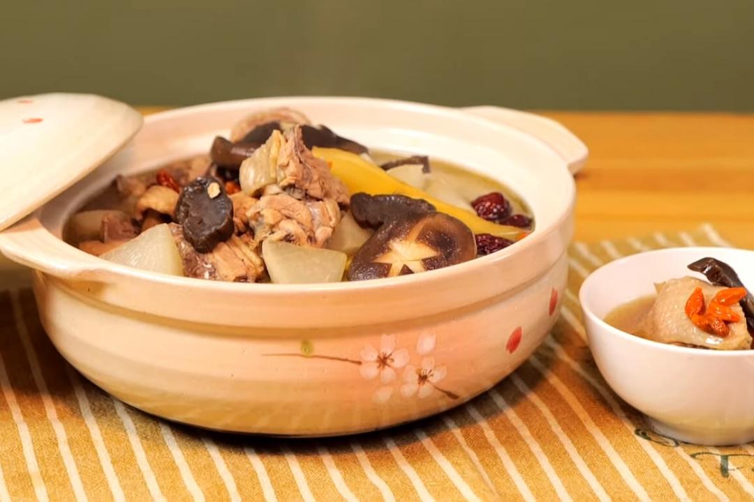 把土雞塊放入湯鍋後,加入白蘿蔔、老菜脯、薑片、少許鹽、米酒1大匙、白胡椒粉少許、糖1小匙、醬油1小匙、香菇5朵和水1500c.c.,蓋上以中火煮約半小時,熬到蘿蔔變軟,開蓋後加香油1小匙、紅棗15粒再燉煮10分鐘,最後加入枸杞裝飾即可完成,是不是很簡單呢?