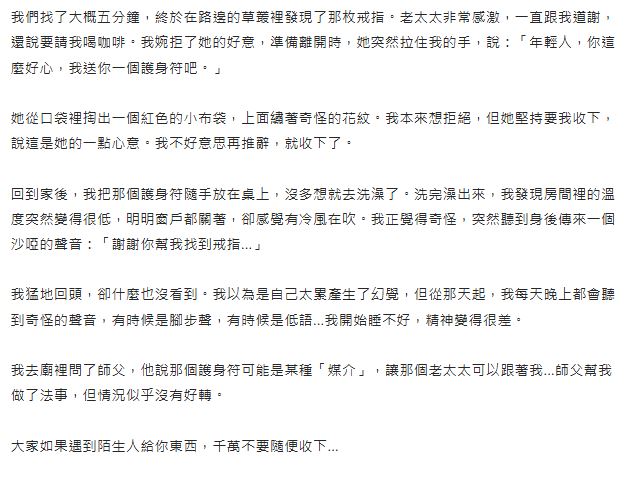 原PO嚇壞了,以為自己幻聽,但在那之後,她陸續聽到多種怪聲,有時是腳步聲、有時是低語,「我去廟裡問師父,他說護身符可能是某種媒介,讓那個老太太可以跟著我...」做完法事後,她也勸誡大家,碰到陌生人給的東西,千萬不要隨便收。