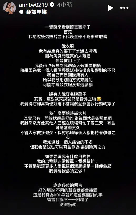妍安也坦言,照片只記錄了剛到現場狀況較好的時刻,之後同樣忙得相當狼狽。她強調自己雖然沒有親友在花蓮,但純粹想盡一份心力,希望能讓更多人關注災區議題,「我知道我一個人能做的不多,但我希望我也可以有些作為,盡到微薄之力。如果要說我有什麼目的性,我的出發點非常簡單,我想幫忙!不管是能讓更多人重視這個議題還是一種使命感,我覺得我必須去做!」。