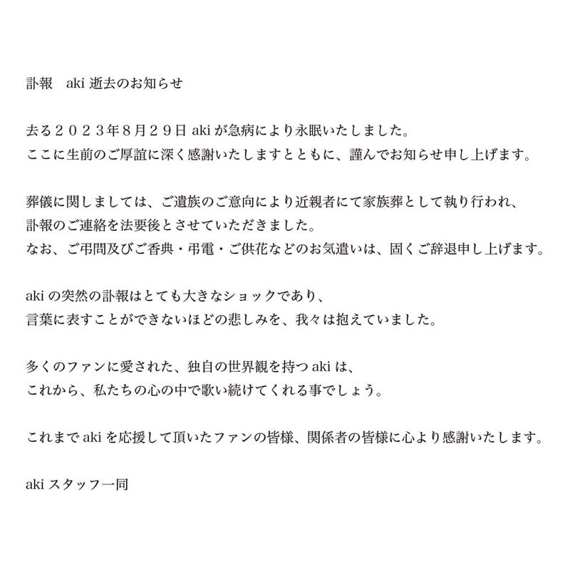 據《三立新聞》報導,Aki經紀公司昨日發布推特證實噩耗,文中透露他8月29日因疾病迅速病發過世,根據家屬的意願,將以私人葬禮方式舉行,告別式也不對外開放,嚴拒任何弔唁、慰問電話、鮮花等哀悼,盼外界給予空間,並感謝各位昔日的喜愛,希望讓Aki繼續在大家心中唱歌。