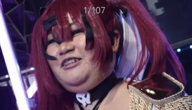 根據《TVBS新聞網》、《NOWnews今日新聞》報導,從曝光的照片中能夠看到,這位女Coser配戴著紅色雙馬尾假髮,手持道具對著鏡頭擺出各種姿勢。然而在缺乏濾鏡與修圖技術的輔助下,她的臉部輪廓顯得較為圓潤豐腴,下顎與頸部的線條不夠分明,甚至出現了明顯的雙下巴,微笑時還能看見矯正牙齒的牙套,整體身型也顯得較為結實。
