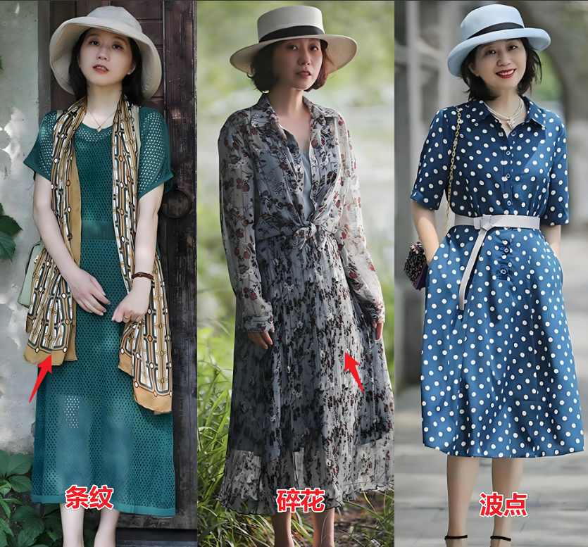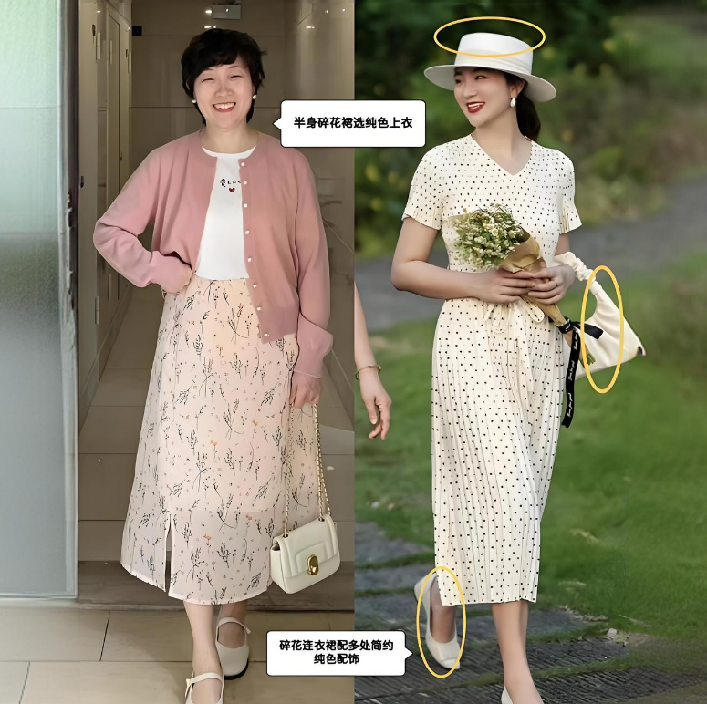 前面我們有提到一點,那就是顏色的明度和複雜度也會影響一個人的視覺年齡,像有些媽媽們穿著的碎花裙,飽和度太高了,色彩斑斕、花色複雜且密集,不僅看起來顯得老氣橫秋,也拉低了一身的氣質以及外界對她們的印象。