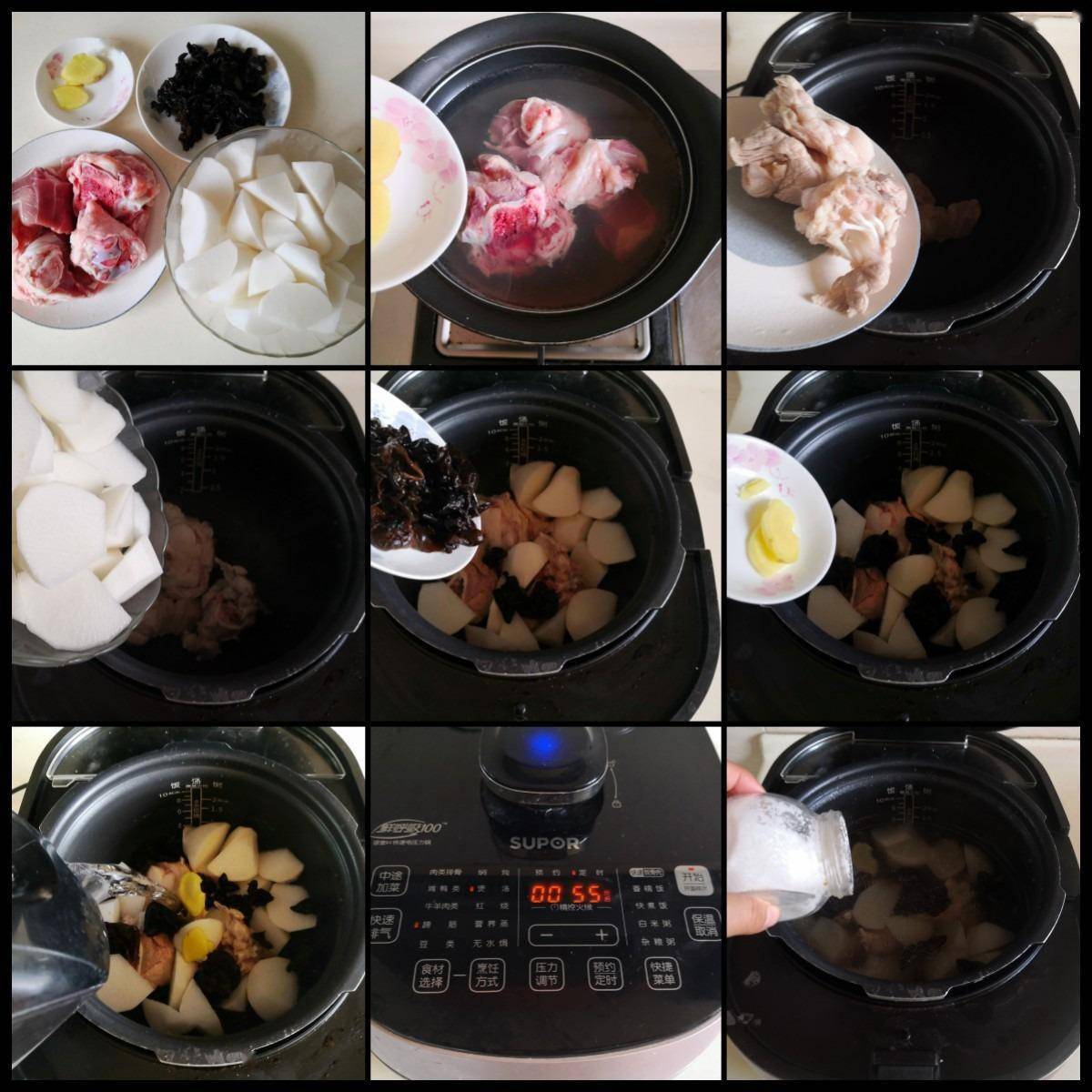 2. 將焯好的棒骨、白蘿蔔和黑木耳放入電燉鍋中,加入薑片和適量的水,注意水要一次性加足,不要中途加水;