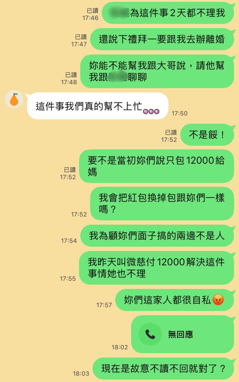 不料事情很快就被揭穿,因為婆婆收到紅包後交由小姑保管,而小姑事前已知道哥哥要包3萬6千元,發現金額不對便向哥哥確認。此事曝光後,人妻的丈夫震怒不已,甚至提出離婚。人妻事後頻頻喊冤,還怪小姑亂講話,要求小姑一起湊齊被她私吞的錢,她也請大嫂幫忙去說話,結果大嫂卻不願干涉,「我真的沒見過這麼無恥的一家人」。