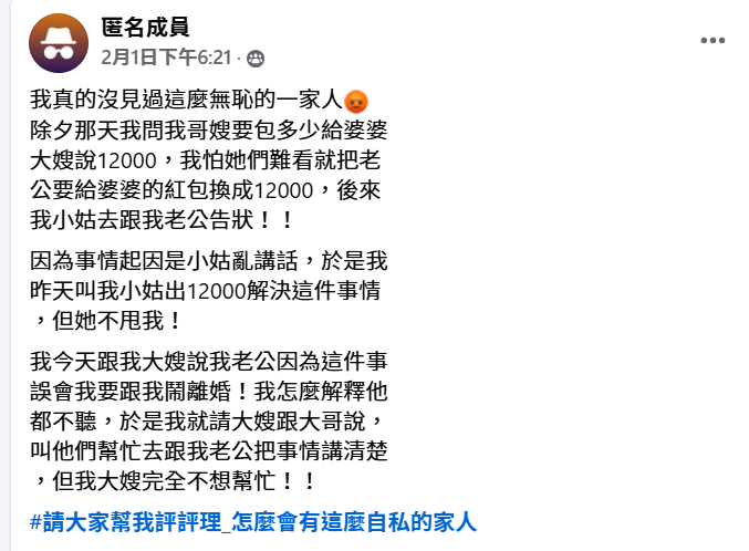 一名女網友在臉書社團「爆怨公社」發文指出,在除夕當天詢問大嫂要包多少紅包給婆婆,得知大嫂準備包1萬2千元後,便擅自將丈夫原本要給的3萬6千元紅包改成1萬2千元,私自拿走了2萬4千元。她聲稱此舉是為了維護婆家和諧,避免大伯、大嫂難堪。