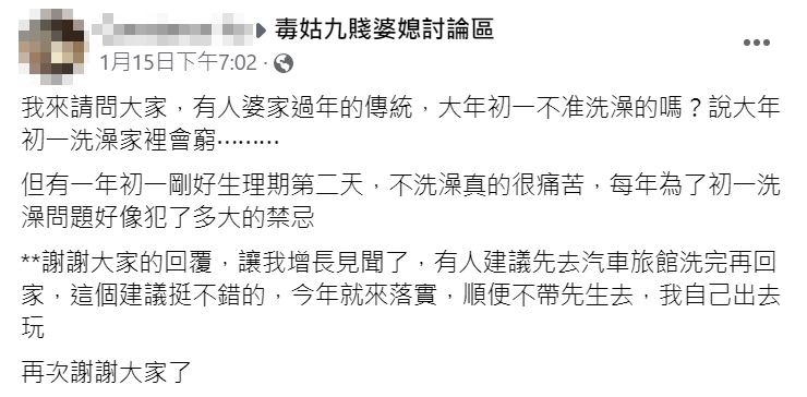婆家「禁初一洗澡」說會變窮!媳婦正好「那個來」不能洗超痛苦...網支招笑虧:沒洗也不會變有錢啦