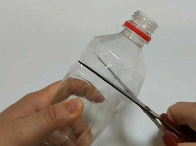 將調製好的溶液放到一旁備用,接下來就該製作誘捕器了。首先就需要取一個塑膠瓶子,將塑膠瓶子剪成兩半,把調製好的溶液倒入瓶子的下半端,至於上半端也不要著急扔掉,直接倒扣在下半端就可以了,這樣一個倒置的漏斗結構形狀就製作完成了,由於這種結構的瓶口窄下端寬,所以蚊子進入誘捕器後很難飛出來。