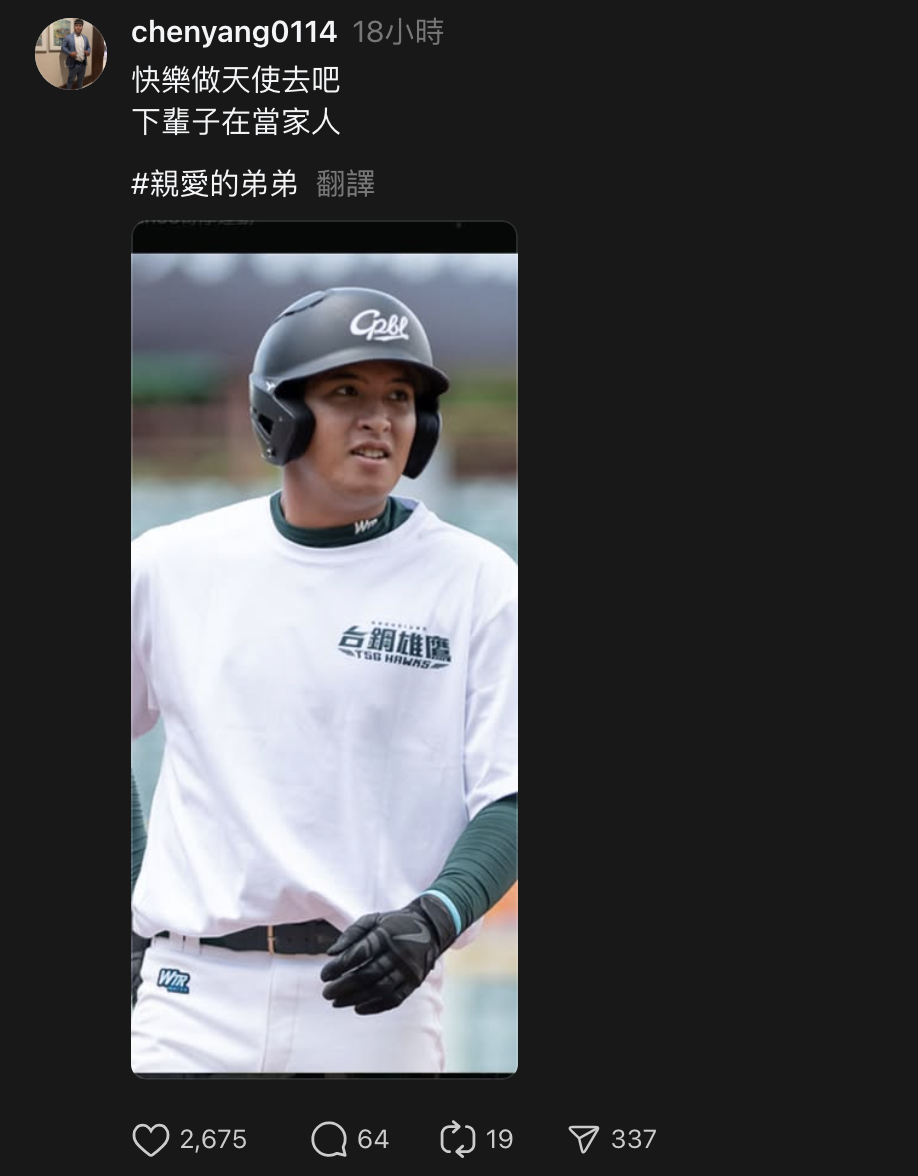 如今再也無法看到他奮力追夢的身影,驚傳賴丁誌1月22日發生車禍抱憾離世,陳子豪的弟弟陳子揚在社群媒體上證實噩耗,悲慟哀悼:「快樂做天使去吧!」喊話親愛的弟弟下輩子再當家人,話語表達對這位表弟的不捨與思念,也讓整個棒球界為這位年輕好手的驟逝感到無比惋惜!