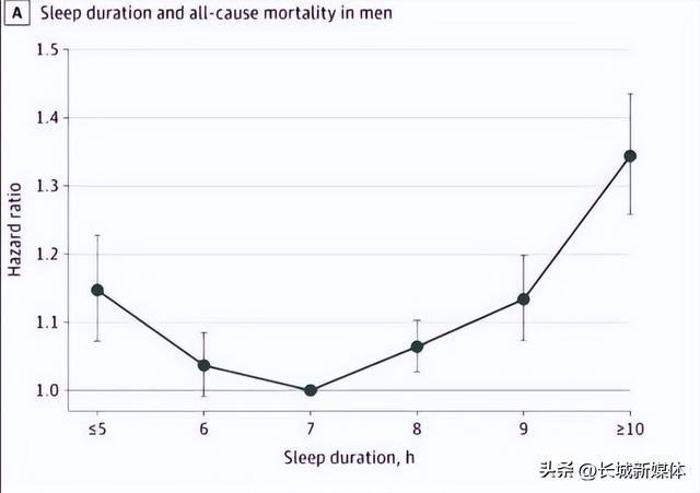 在男性中,與7小時的睡眠相比,每晚睡眠超過該數值,比如達到8、9、10小時,全因死亡率將分別升高9%、18%和43%;而睡眠不足5小時,參與者的全因死亡率也會升高16%。