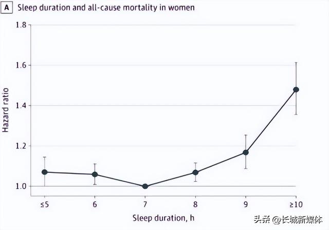 在女性中,與每晚7小時睡眠相比,多睡1小時或少睡1小時均會使全因死亡率升高。換句話說,睡得太久對健康的損害竟然會更大!