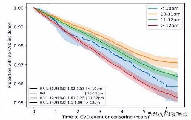 與 22:00 - 21:59 入睡相比,23:00-23:59 入睡的人患心血管疾病的風險高12%,在午夜或更晚入睡的人高 25%,而22:00 之前入睡的人高24%。與 22:00 - 21:59 入睡相比,23:00-23:59 入睡的人患心血管疾病的風險高12%,在午夜或更晚入睡的人高 25%,而22:00 之前入睡的人高 24%