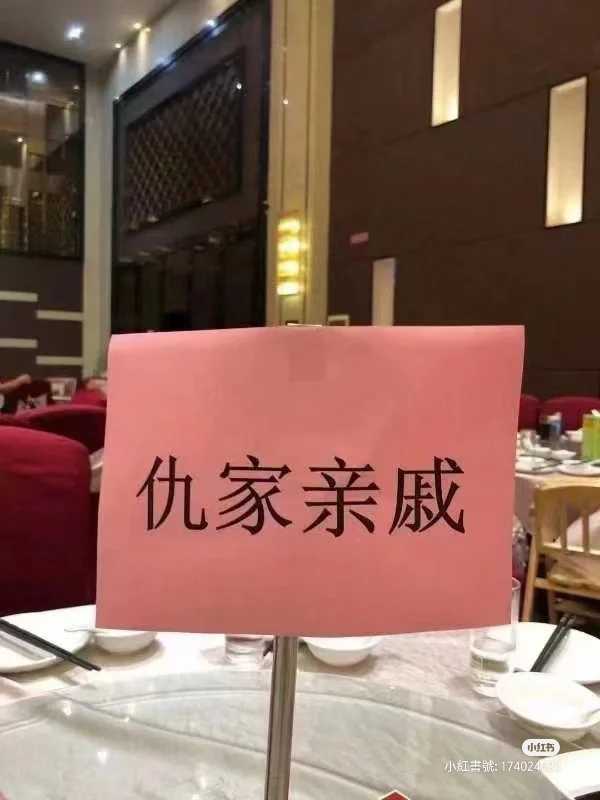 就有一名中國網友分享了一張照片,從照片場景看來是有對新人在飯店辦婚宴,而宴席中就有其中一桌的桌牌寫著「仇家親戚」,讓人看傻了眼、內心OS「真的假的?」,沒想到這場的新人或主家竟然連仇家的家族都能請來?!