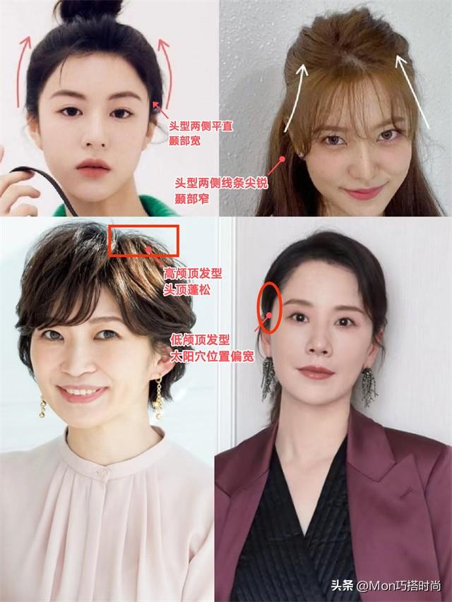 頭型兩側的線條弧度則為顳部形狀,若該處線條平直,則多為低顱頂、大頭圍,則需要頭頂蓬鬆的高顱頂髮型去修飾。該處線條尖銳,通常為高顱頂,需要選擇低顱頂、但太陽穴兩側有空氣感的髮型去讓臉型更完美精緻。
