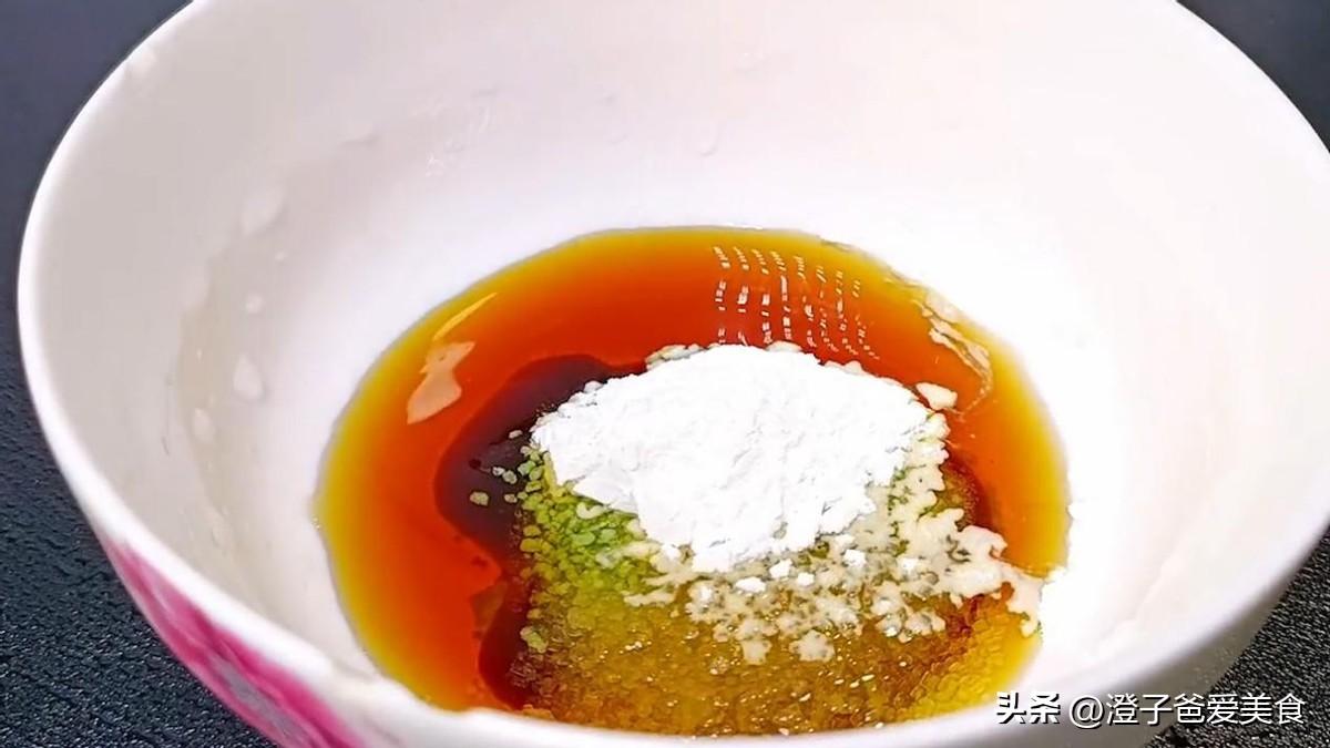 5.再準備一個小碗,放入一勺生抽、一勺陳醋、一勺蚝油、一勺食鹽、一勺雞精、一勺白砂糖、一勺玉米澱粉,倒入一點清水,攪拌均勻備用。