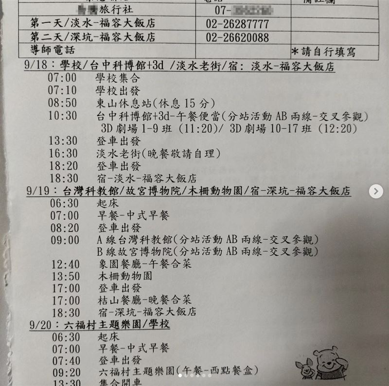 根據這份行程表可以看到,學生們第一天會從屏東學校出發前往台中科博館,晚上到新北淡水老街,當晚入住淡水福容大飯店;第2天參觀科教館和故宮,下午逛木柵動物園,晚上入住深坑福容大飯店;最後一天上午在新竹六福村玩,下午1點半集合出發南下回學校。