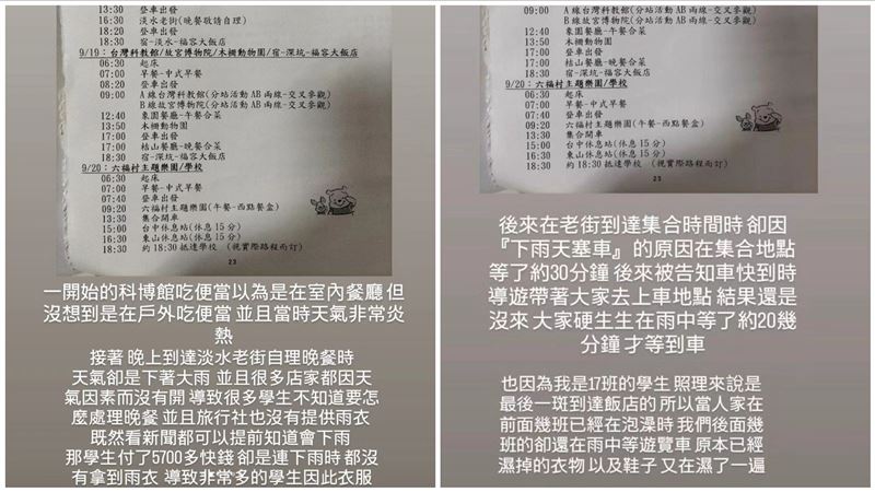 學生表示行程從第一天就開始怪怪的,第一天在科博館吃便當本以為是在室內餐廳用餐,沒想到卻是叫學生在頂著烈日在戶外平台吃飯;晚上則是在淡水老街「晚餐自理」,但因為下大雨街上餐廳都沒開,旅行社又沒提供雨衣,學生只能濕身逛街覓食,吃完飯學生集合搭車回飯店,卻被告知因為「雨天塞車」遊覽車遲到,最後學生們站在雨中等了50分鐘才搭上車。
