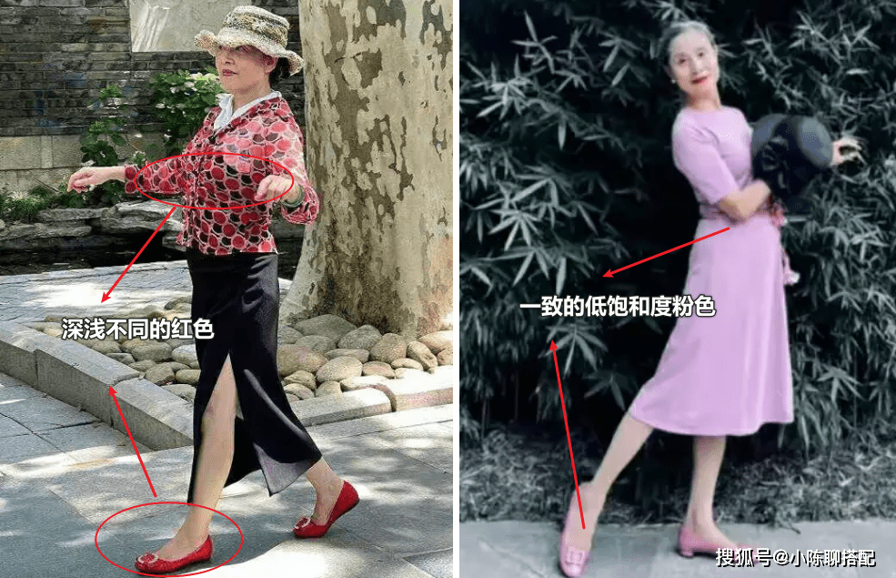 鞋子和包包等屬於配飾,面積比例比較小,在色彩上可以肆意一點,除了黑白棕,一些鮮艷的鞋子反而可以點睛。不過,鞋子的選擇還是要避免盲目,尤其是彩色,與衣服顏色有呼應更為完整,比如紅色鞋子與上衣相互呼應,深淺不同更凸顯時尚感;如果衣服顏色飽和度高,鞋子顏色和衣服保持一致更有比例。