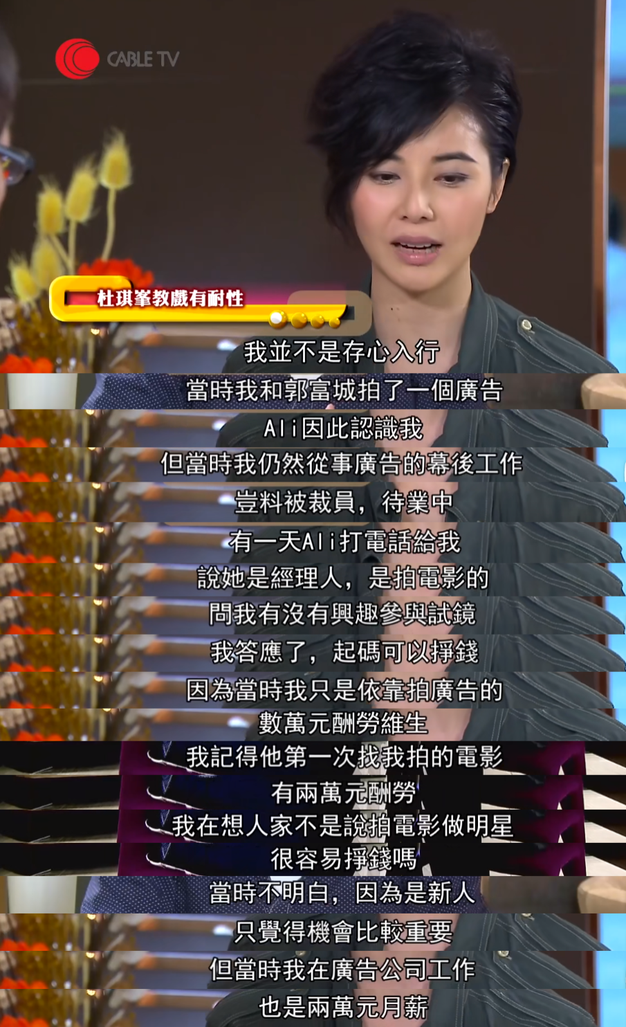 因為被裁員後,後來成為她經紀人的Ali就打電話找她,問她沒有興趣去參加電影試鏡,正愁沒工作沒收入的她欣然應下,她還清楚記得自己拍的第一部電影拿到了兩萬塊錢的酬勞,跟她在廣告公司的月薪差不多。