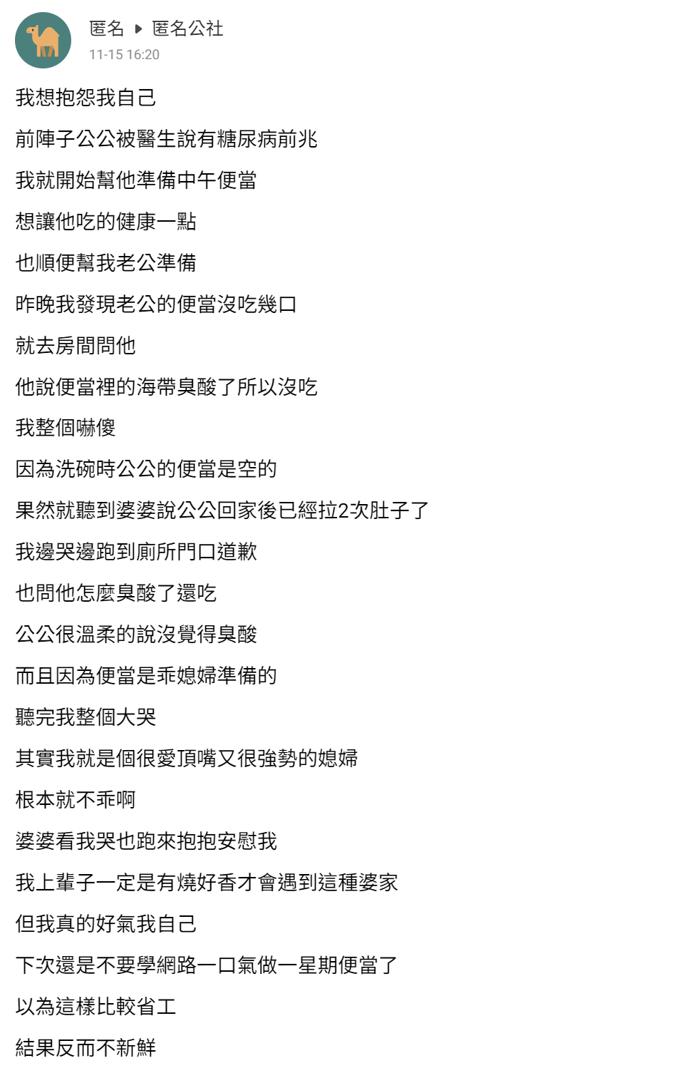 原PO坦言,其實自己是愛頂嘴又強勢的媳婦,根本就不乖巧溫順,而婆婆看到她在哭還跑過來抱抱她、安慰她,讓她忍不住感動直呼:「我上輩子一定是有燒好香才會遇到這種婆家,但我真的好氣我自己。」並反省:「下次還是不要學網路一口氣做一星期便當了,以為這樣比較省工,結果反而不新鮮。」