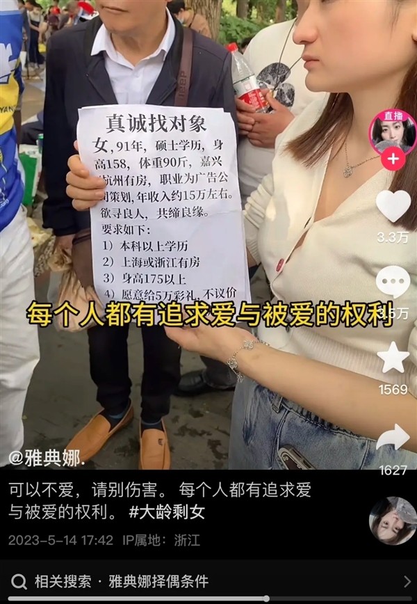 這天她拿著相親海報到杭州公園找對象,開出4個條件:(1)本科以上學歷 (2)在上海或浙江有房子 (3)身高175以上 (4)彩禮要5萬人民幣(約22.16萬台幣),不議價