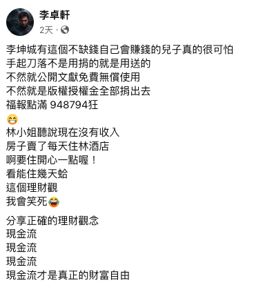 資深音樂人李坤城4月因大腸癌過世,兒子李卓軒便和繼母林靖恩展開一連串唇槍舌戰。後來雙方以和解形式解決此事,林靖恩收穫台中房產,而李卓軒則取回亡父的著作權、收藏品。本應相安無事,李卓軒近日卻再度開砲。他9日於臉書發文,爆料林靖恩才繼承房產19天,就將它出售變賣,如今則爽住在林酒店,「啊要住開心一點喔!看能住幾天蛤!」,更在文末狂酸對方,「這個理財觀,我會笑死!」。