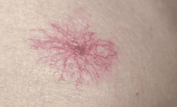 肝臟代謝能力下降時,就會出現蜘蛛痣,近觀中央有凸起的小紅點,微血管從紅點四散開,大小不一,最大直徑可長至1.5 cm,多長在頸部、臉上等部位。