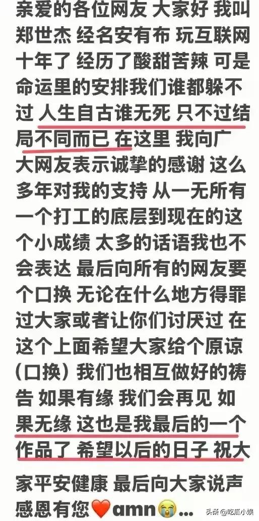 按照當地習俗,鄭世傑的網路帳號已清空所有作品,只留下那篇感人至深的告別信。在這封「絕筆」中,他回顧了自己在網站的十年奮鬥歷程,感謝粉絲的支持,也為自己可能得罪過的人請求原諒。