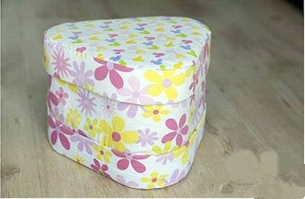 4.把兩片紙盒用膠帶粘起來用作蓋子,縫好的布料翻過來,再把紙盒與布料縫一起
